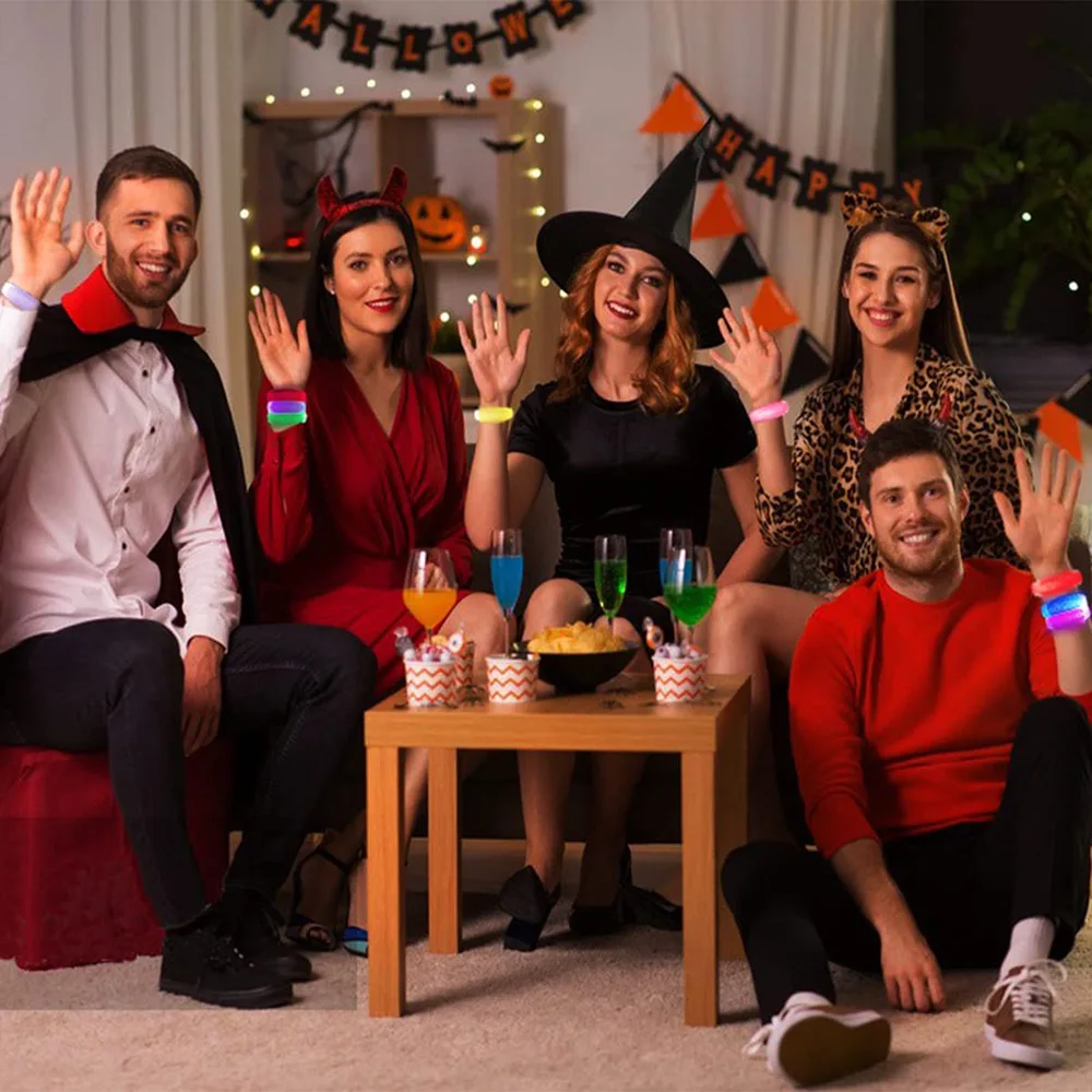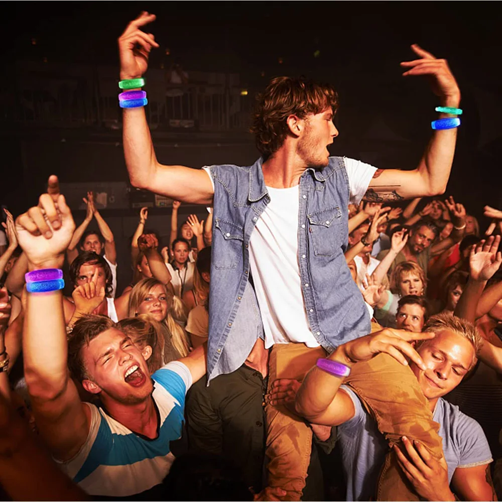 4. Aplicação em várias cenas: pulseira de bolha LED, pulseira flash no escuro tem uma variedade de cores, luzes coloridas piscando constantemente, assim como o arco-íris está iluminado no escuro, tornando você o foco do palco; Ideal para entretenimento, festas rave, aniversários, festivais, casamentos, atividades noturnas, fogueiras, discotecas, carnavais, Halloween, eventos internos e externos, festas rave e muito mais para entretenimento ou celebrações